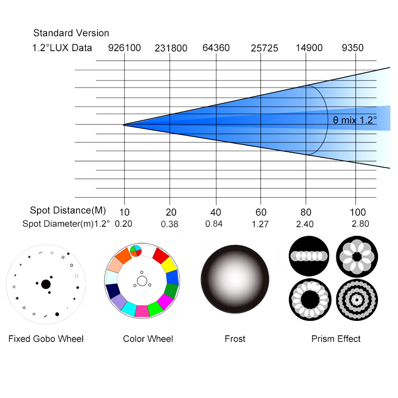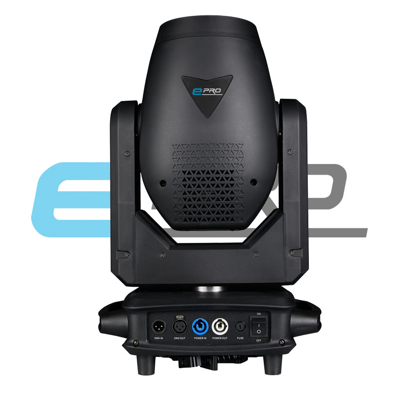 Equipada con una potente lampara de descarga 20R de 420w , unido a un sistema óptico de ultima generación y alto rendimiento que concentra toda la potencia a tan solo 1.2º de apertura con un diámetro óptico de 200mm .