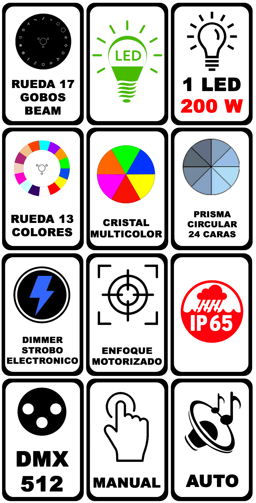 Entre sus múltiples efectos se encuentran su rueda de 17 gobos beam , rueda de 13 colores + dual , cristal multicolor , prisma circular de 24 caras , enfoque y dimmer/shutter electrónico .