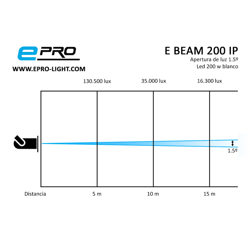 Pese a su tamaño , su gran potencia es gracias a su led monoblock blanco (9.000k) con una potencia de 200w , alto rendimiento y una vida útil de 50.000 horas . Todo ello sumado a un grupo óptico de máxima calidad de triple capa , que concentra la luz a tan solo 1,5º , con un diámetro óptico de 130mm .