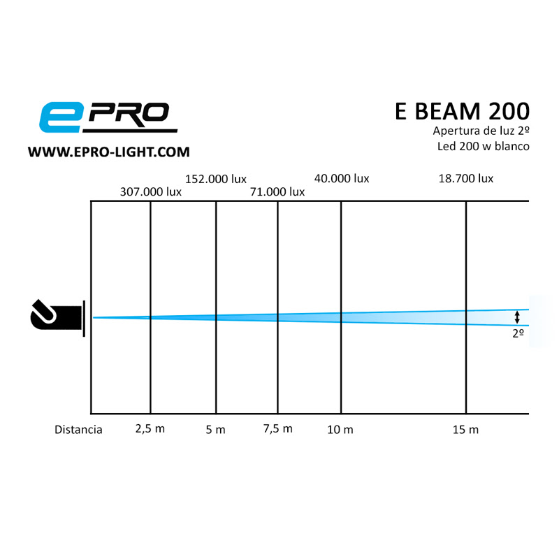 Pese a su tamaño , su gran potencia es gracias a su led monoblock blanco (9.200k) con una potencia de 200w , alto rendimiento y una vida útil de 50.000 horas . Todo ello sumado a un grupo óptico de máxima calidad de triple capa , que concentra la luz a tan solo 2º , con un diámetro óptico de 150mm .