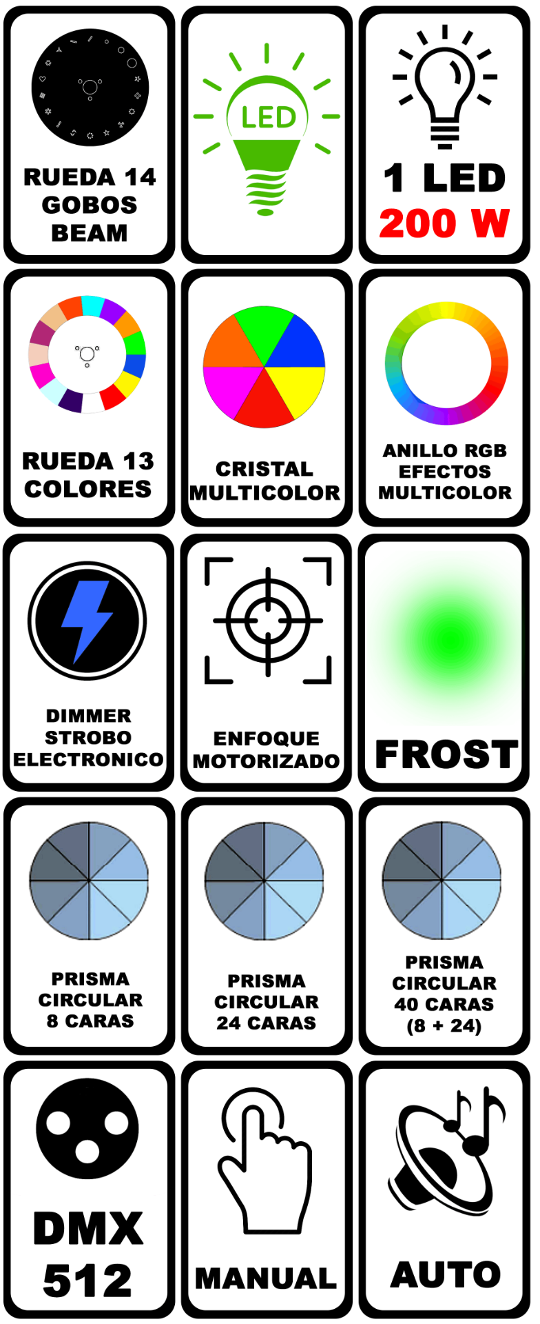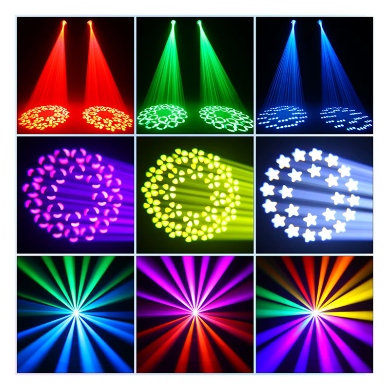 Entre sus múltiples efectos se encuentran su rueda de 14 gobos beam con reductores de haz , rueda de 13 colores + dual , cristal multicolor , 2 prismas circulares combinables (8 caras + 24 caras) , frost , enfoque , dimmer/shutter electrónico y anillo led RGB multiefectos .