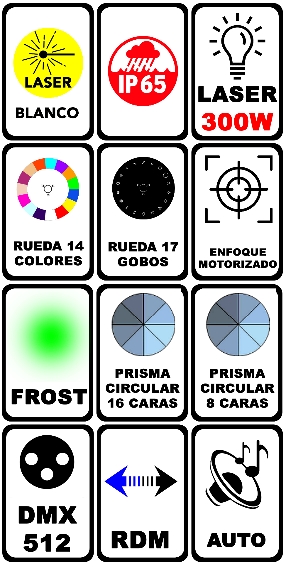 Dispone de gestión RDM y con sus 11 o 15 canales DMX , con los que podrá obtener efectos espectaculares gracias a sus 17 gobos estáticos, Rueda de 14 colores + Dual + blanco , prisma circular de 8 caras , shutter 0.5 / 20hz , dimmer electrónico , difusor frost .