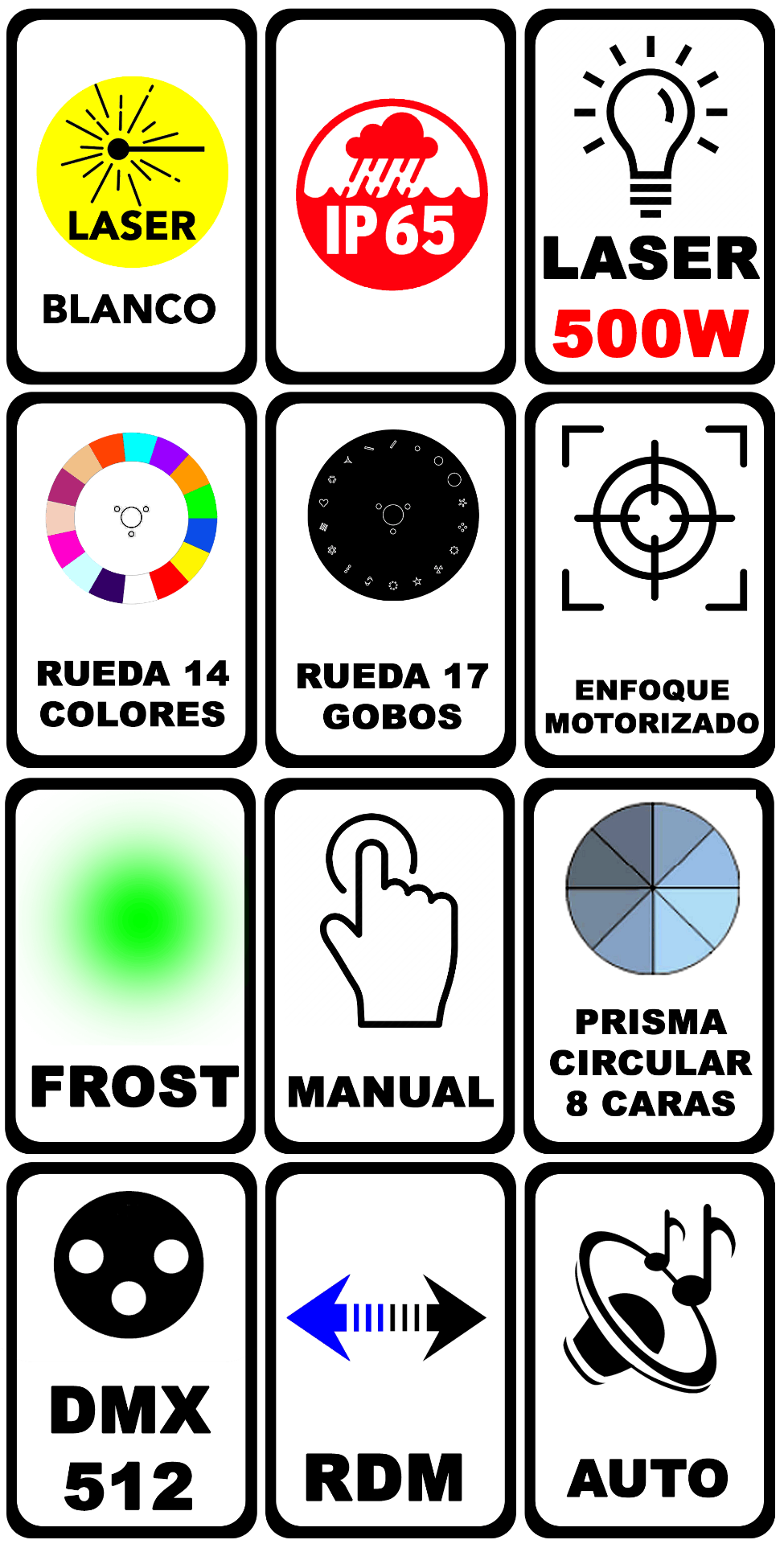 Dispone de gestión RDM y con sus 12 o 15 canales DMX , con los que podrá obtener efectos espectaculares gracias a su rueda de 17 gobos estáticos, Rueda de 14 colores + Dual + blanco , prisma circular de 8 caras , shutter 0.5 / 20hz , dimmer electrónico , difusor frost .