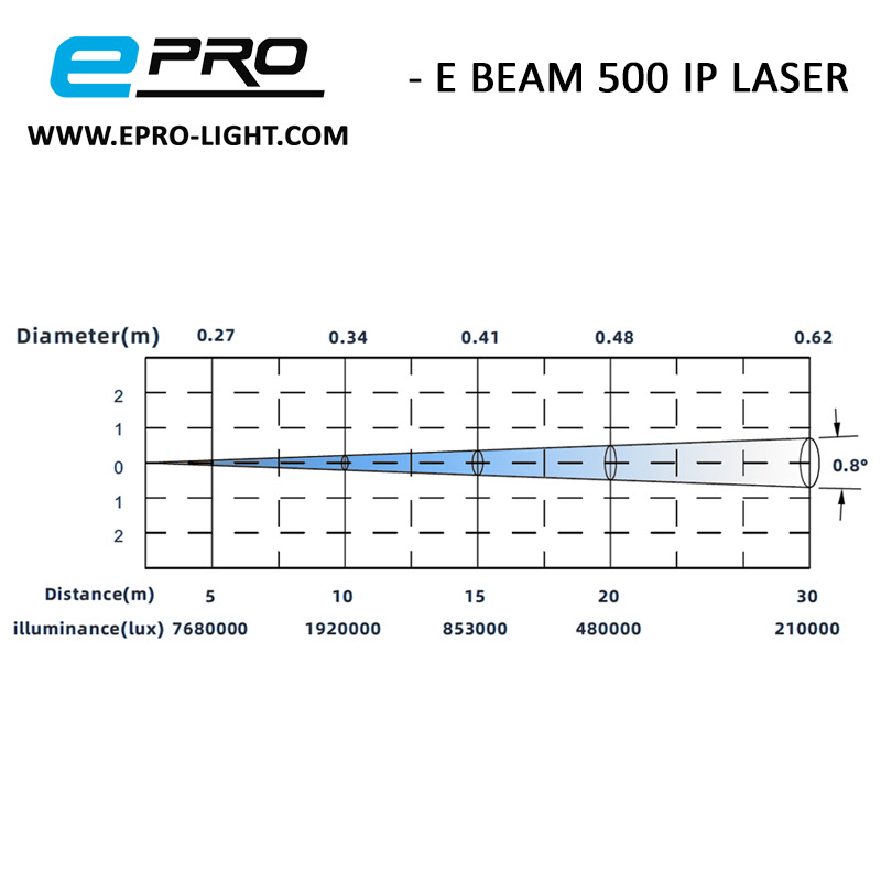 Este modelo incorpora un modulo laser blanco (7.300k) de base fosforo , 20.000 horas de vida estimada y una potencia de 500w . Unido a un grupo óptico de alto rendimiento , se consiguen unos niveles de luz de potencia extrema que llegan hasta los 480.000 lux a 20 metros de distancia . Todo ello con un diámetro óptico amplio de 200mm , que otorga un haz ancho y uniforme . Concentrando toda la potencia a tan solo 0.6 grados de apertura consiguiendo un haz paralelo .